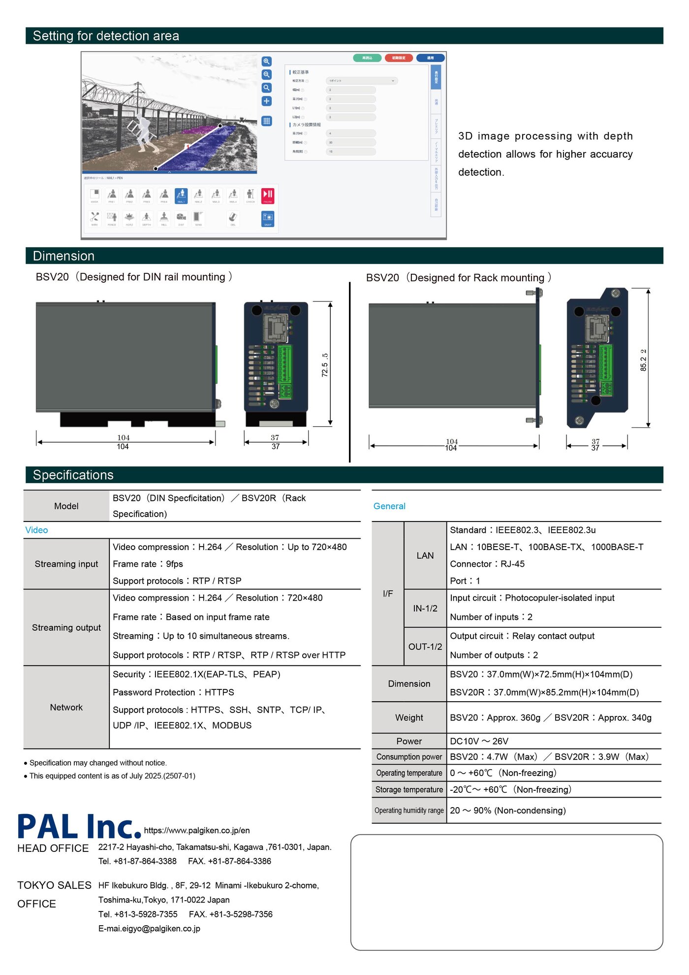 BSV20R:37.0mm(W) × 85.2mm(H) × 104mm(D) (the body , includes rack mounting attachment)Streaming output Video compression:H.264 Resolution:720 × 480