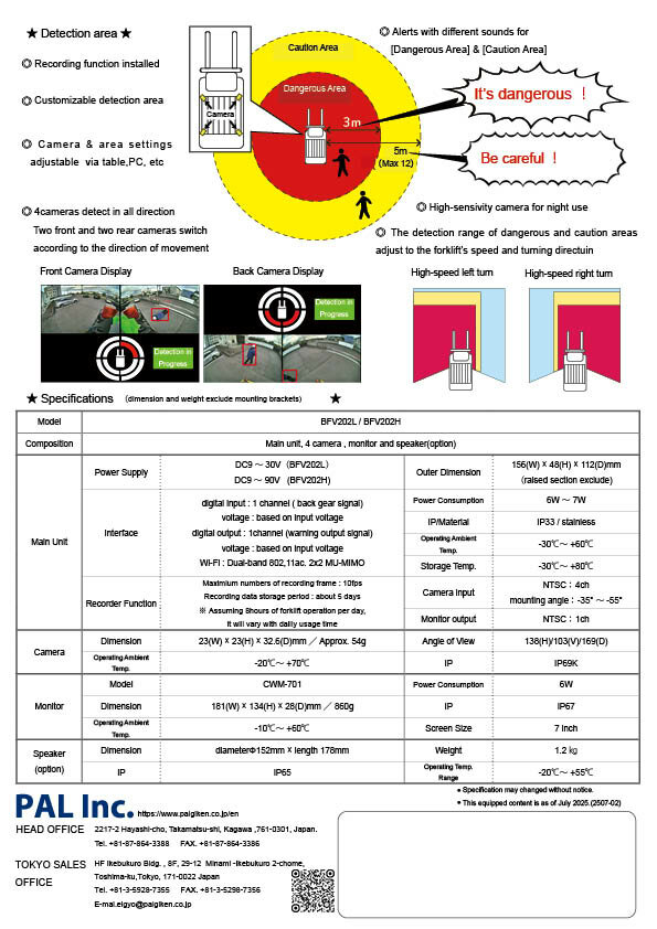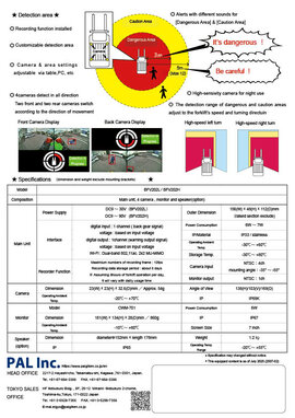 This safety assistance system uses four cameras, two mounted on the front and two on the rear of the forklift. The display on the monitor automatically switched based on the direction of movement. Using AI based image analysis, the system alerts the driver through visual and audio warnings, supporting safer operation.