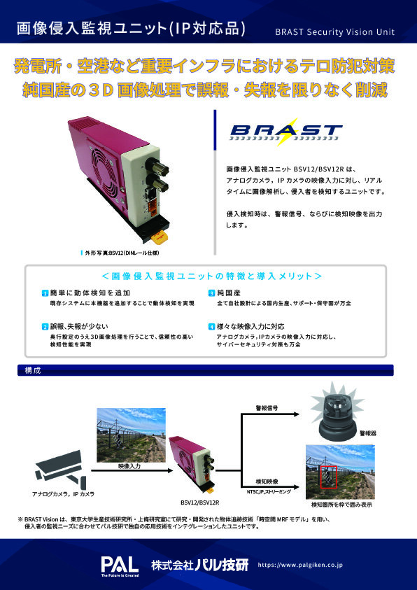 画像侵入監視ユニットBSV12/BSV12Rは、アナログカメラ、IPカメラの映像入力に対し、リアルタイムに画像解析し、侵入者を検知するユニットです。侵入検知時は、警報信号、ならびに検知映像を出力します。